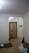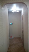 По полу выполнена стяжка, уложен влагостойкий ламинат в т.ч. и на кухне, укладка по диагонали. Стены штукатурились гипсовой штукатуркой по маякам, шпаклевание, обои.