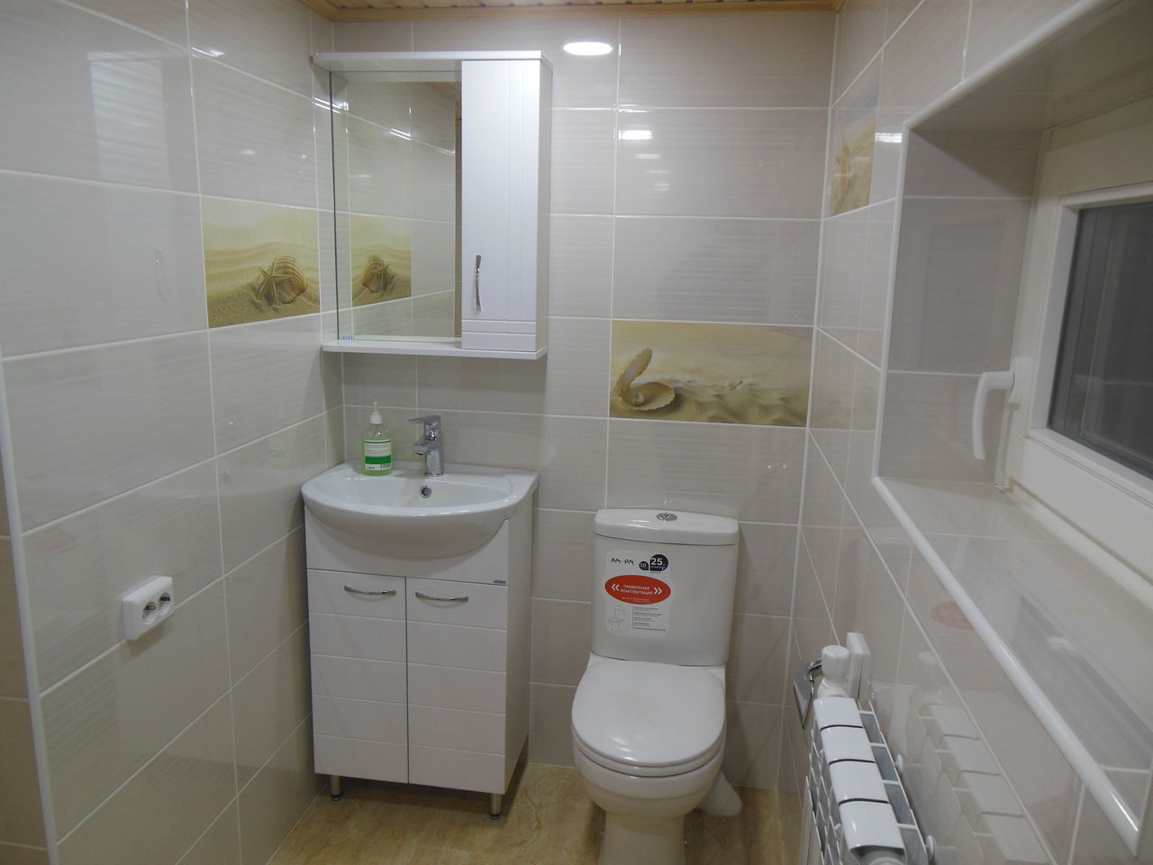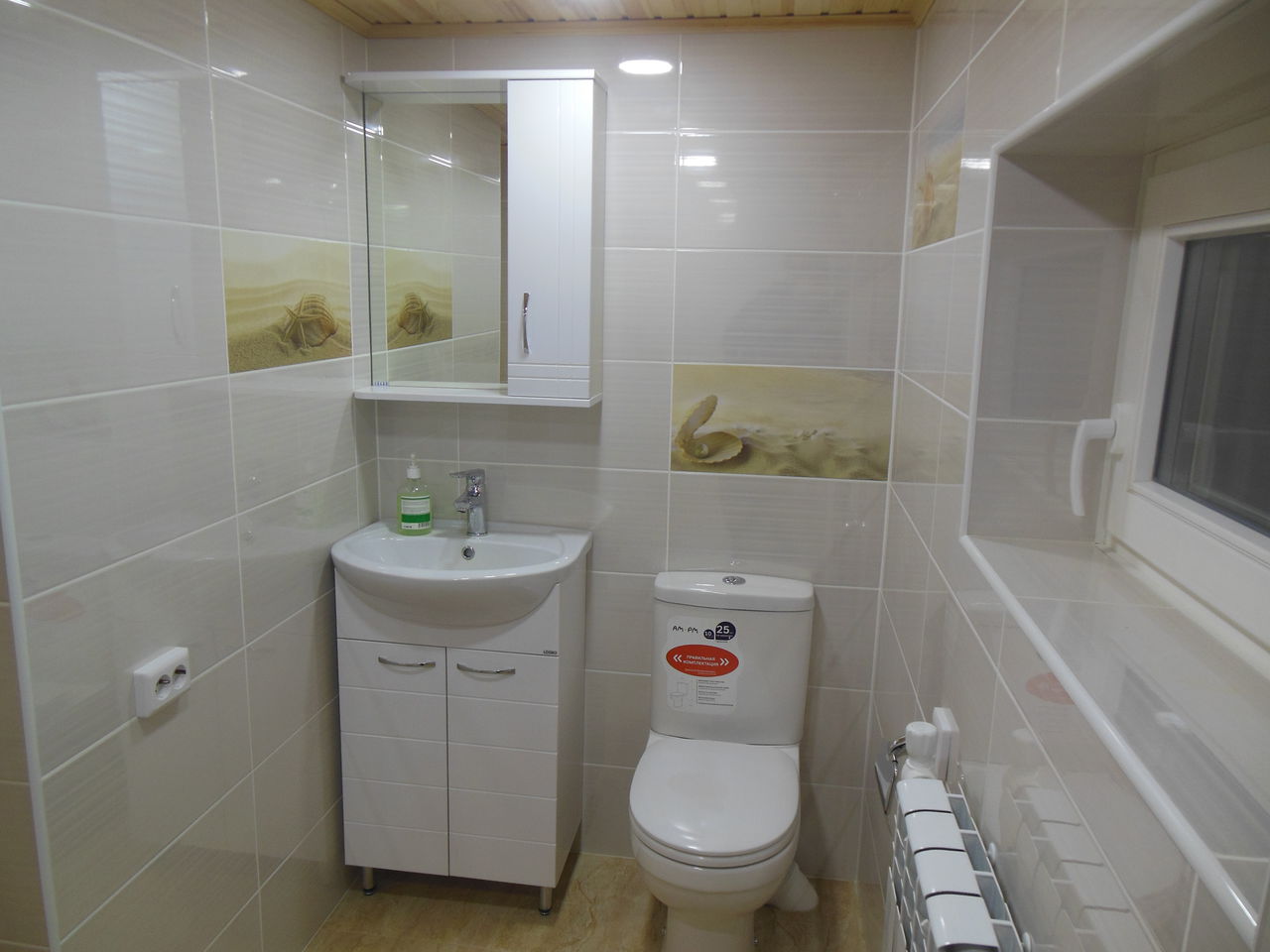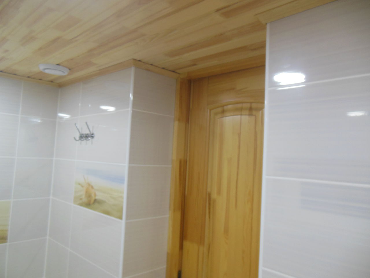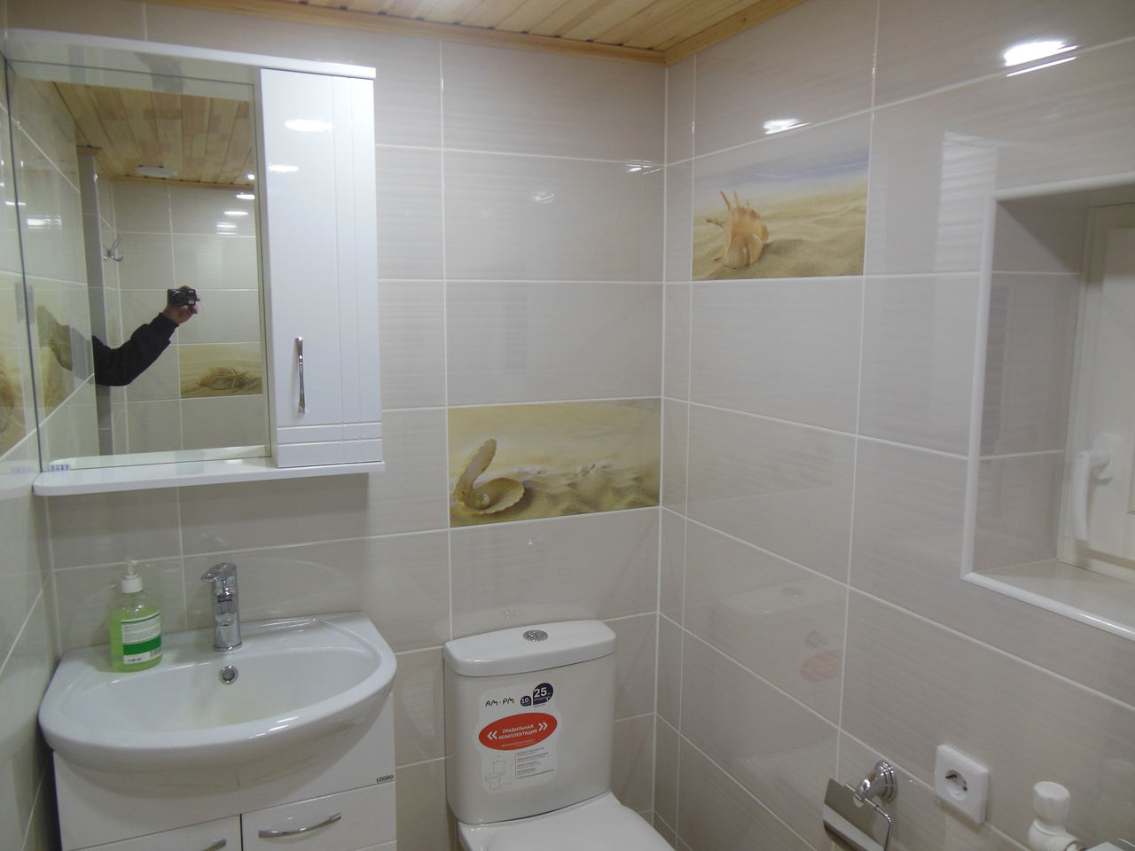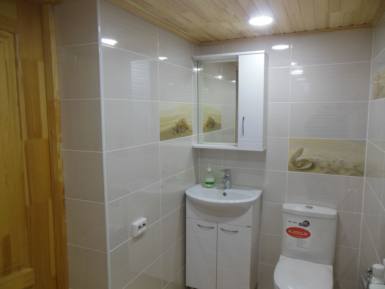 Далее залита стяжка, оштукатурены стены, выполненна облицовка пола и стен пленкой. Потолок выполнен из деревянной вагонки, сосна, т.к дом деревянный. Установленна сантехника, аксессуары.