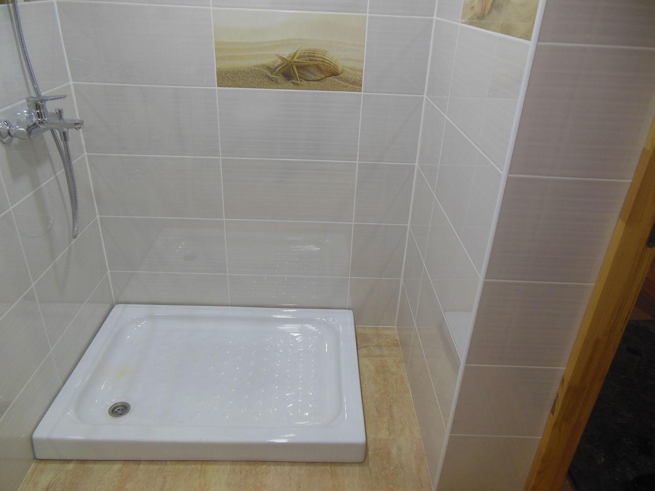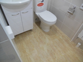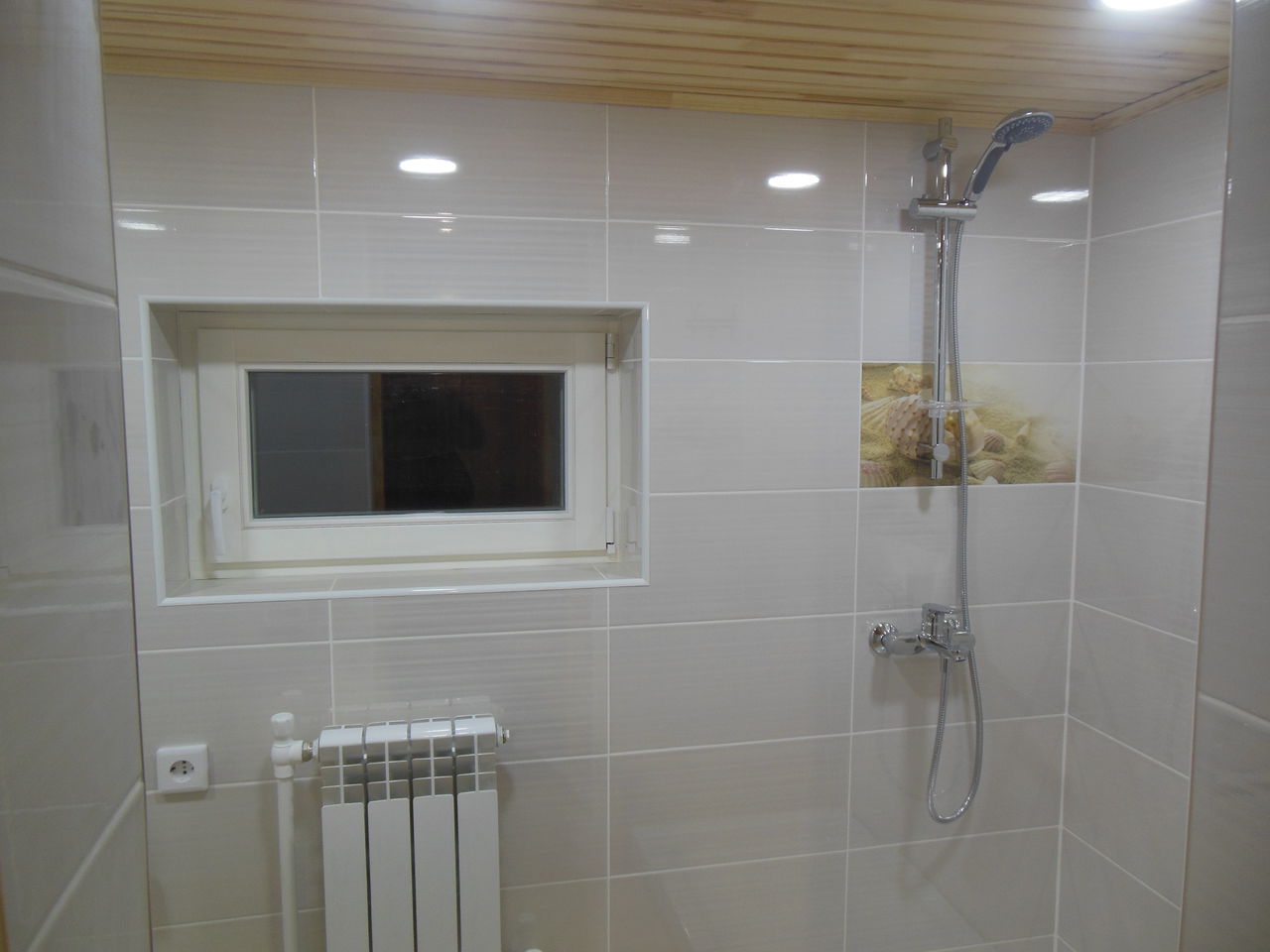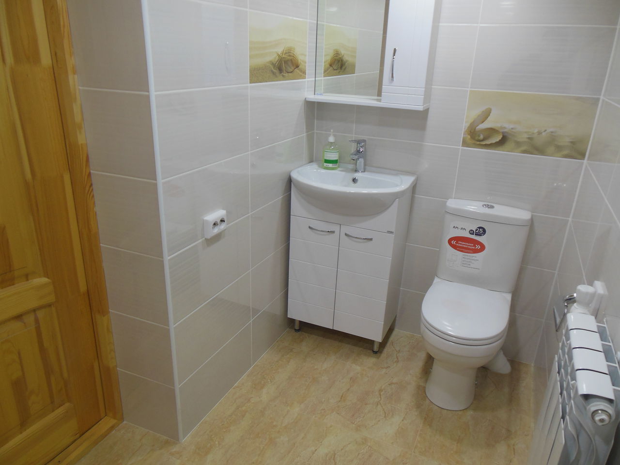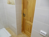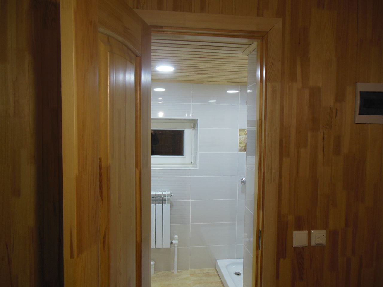 Далее залита стяжка, оштукатурены стены, выполненна облицовка пола и стен пленкой. Потолок выполнен из деревянной вагонки, сосна, т.к дом деревянный. Установленна сантехника, аксессуары.