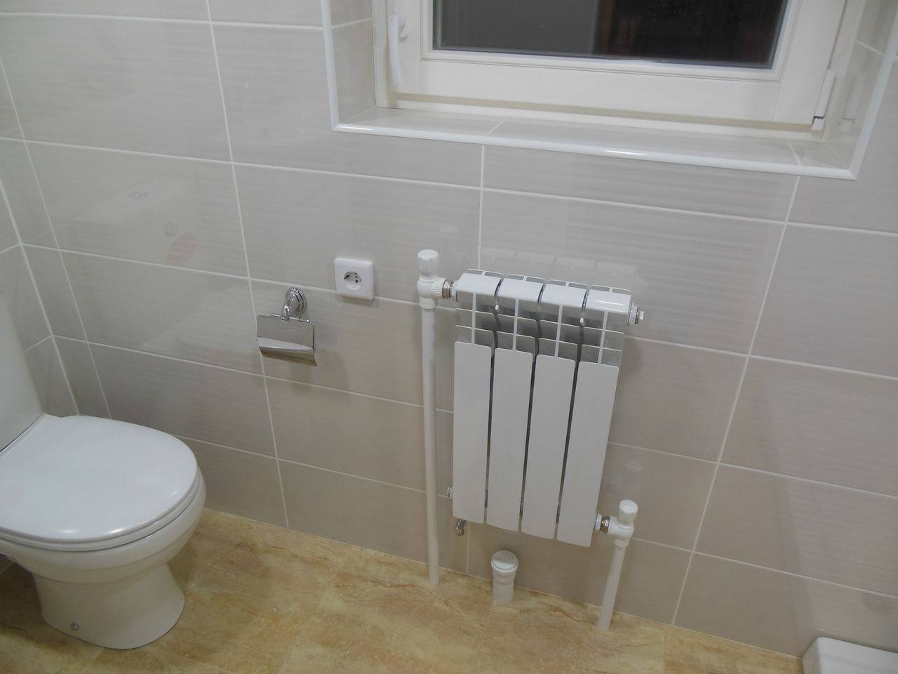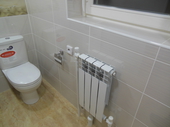 Это пример выполнения нашей компанией, небольшого объема работ (3 м2) большими переделками, отопление двух трубная система (подача, обратка), были проведены по верху пола, краны водяного пола были выведены наружу с подходящими к ним металлопластиковыми трубами " в районе раковины" канализационные трубы и Г.В и Х.В, также частично были проложены поверху, что в небольшом санузле, пусть даже и небольшого частного дома смотрелось бы "страшно". Поэтому до начала отделочных работ, отопления, Т.П водопровод и канализация были переделана полностью. Под батареей выведен кран К.В и слив для стиральной машины, если понадобиться в будущем.